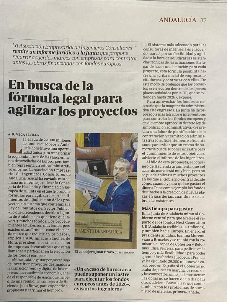La Asociación Empresarial de Ingenieros Consultores de Andalucía remite un informe jurídico a la Junta que propone recurrir a Acuerdos Marco con empresas para contratar antes las obras financiadas con fondos europeos.